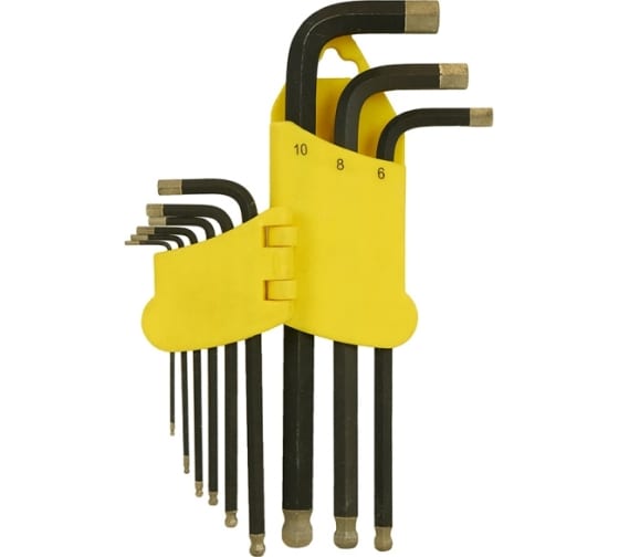 Набор шестигранных ключей предназначен для слесарных и монтажных работ в быту, является универсальным инструментом для работы с наиболее распространенными размерами крепежных изделий. Г-образная форма увеличивает крутящий момент. Набор размещается в пластиковом футляре, который удобен для хранения и транспортировки. Рабочая часть выполнена из стали марки S2, наконечник с алмазным покрытием, что обеспечивает прочность и износостойкость.Отзывы