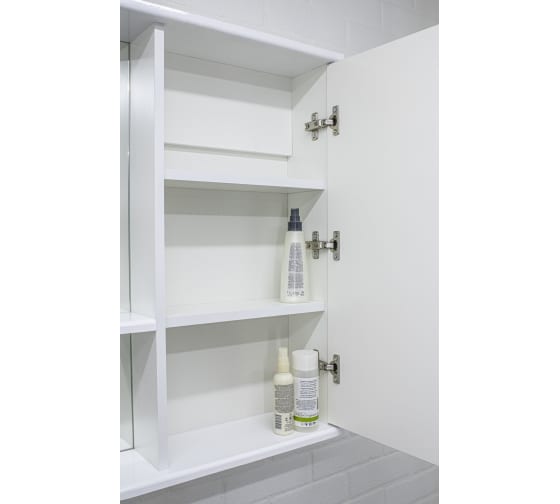 Шкаф – зеркало ВОЛНА 50, ВОЛНА 55, ВОЛНА 60 внутренне пространство которых разделено двумя полками для удобства размещения гигиенических принадлежностей.