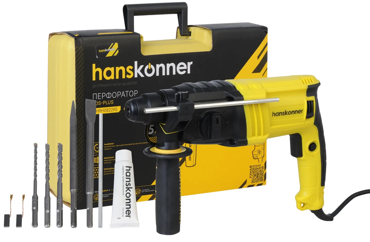 Перфоратор Hanskonner HRH0822RE — компактный, маневренный электроинструмент для сверления отверстий в таких материалах как: пластик, дерево, сталь, кирпич, легкий бетон.В интересах надежного и быстрого крепления оснастки, модель оснащена быстрозажимным патроном SDS+.