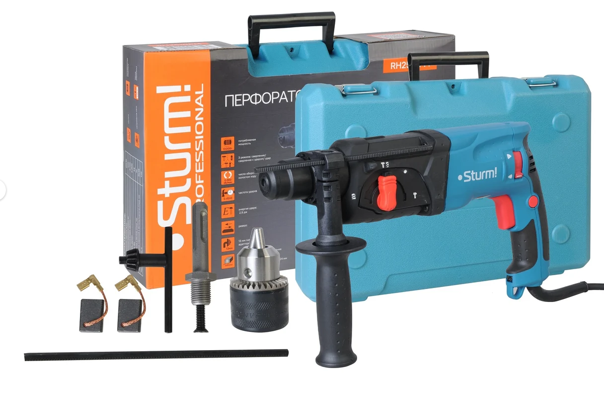 Перфоратор Sturm RH2510PM предназначен для сверления отверстий в дереве, бетоне, металле. На выбор имеются три рабочих режима: сверление, сверление с ударом и чистый удар. Также имеется режим поворота долота для более удобного выполнения некоторых работ, например демонтажа плитки. Мощный киловаттный двигатель обеспечивает отличную производительность. Функция реверса представлена поворотом угольных щеток, что способствует их более длительному сроку службы, а также равной мощности при разностороннем вращении. Данная модель отличается повышенной надежностью за счет модернизированных внутренних узлов.Технические характеристики Sturm RH2510PM