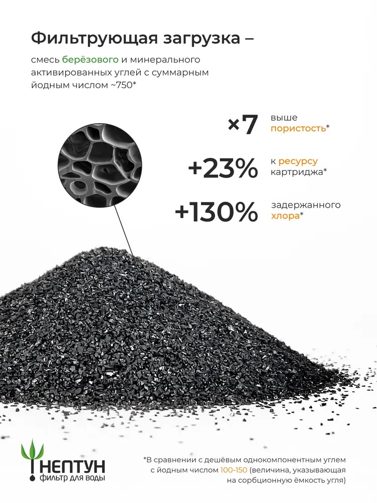 · В несколько раз выше пористость, чем у картриджа из обычного угля, благодаря чему сорбционная емкость и ресурс выше на 30%-40%