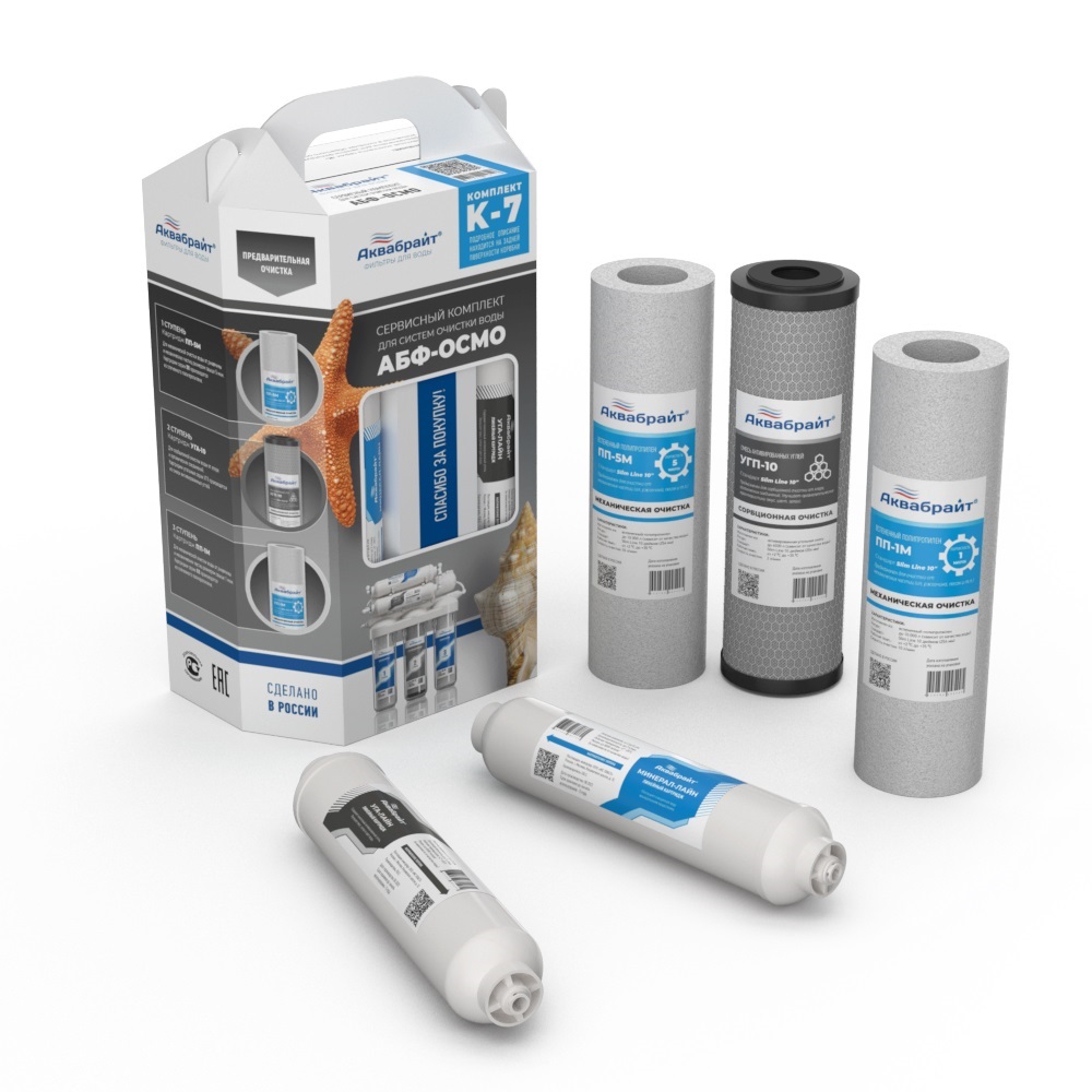 Комплект картриджей К-7 для Осмо 6 без мембраны (ПП-5М, УГП-10, ПП-1, УГА-ЛАЙН, МИН.-ЛАЙН) Аквабрайт (5%)?? Комплект картриджей К-7 от компании Аквабрайт — это идеальное решение для обеспечения эффективной фильтрации воды в системах обратного осмоса. Он предназначен для использования с системой Осмо 6 и включает в себя все необходимые элементы для качественной очистки, что гарантирует получение чистой и безопасной воды для питья и бытовых нужд.