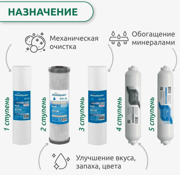 ? Эффективная фильтрация — комплект включает в себя картриджи, которые устраняют различные загрязнения, такие как хлор, органические вещества и механические примеси, обеспечивая чистоту и безопасность воды.
