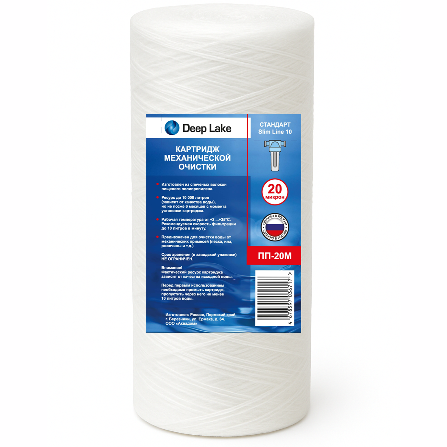 Картридж механической очистки Deep Lake PP-20 мкм, Slim Line 10"Полипропиленовый картридж Deep Lake PP-20 мкм предназначен для механической очистки холодной воды от взвешенных загрязнений. Изготовлен из спечённых волокон пищевого полипропилена, эффективно задерживает песок, ил, ржавчину и другие твёрдые частицы. Совместим с фильтрами стандарта Slim Line 10" (254 мм).
