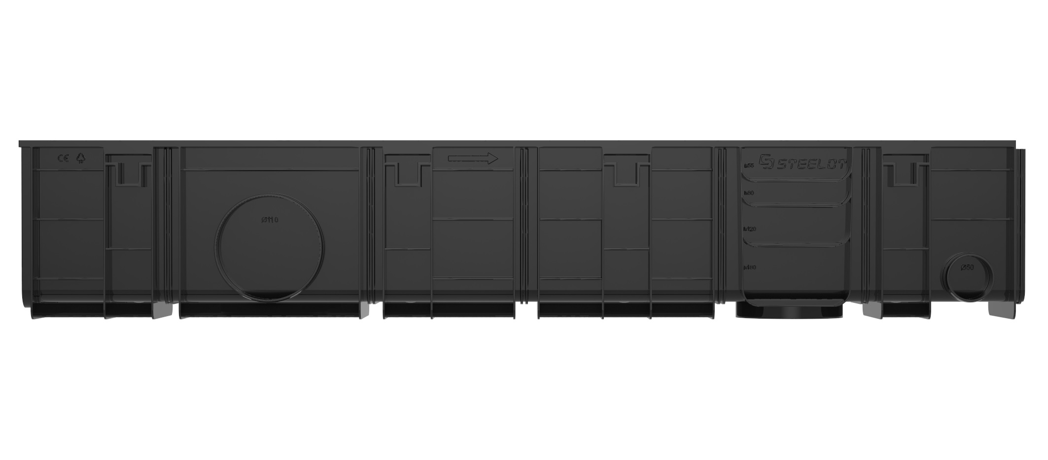 Самые эффективные и отводящие максимальное количество поверхностных стоков в серии водоотводных лотков SteeStart DN100. Отлично подходят для сбора сточных вод с повышенной площадью водосбора, а также территорий с удаленной точкой водосбора. Водоотводные пластиковые лотки серии SteeStart DN100 имеют 5 мест предусматривающих разрез водоотводных лотков для регулировки длины, также в конструктиве предусмотрены технические заготовки для подсоединения отводных канализационных труб диаметром от 50 до 110 мм."