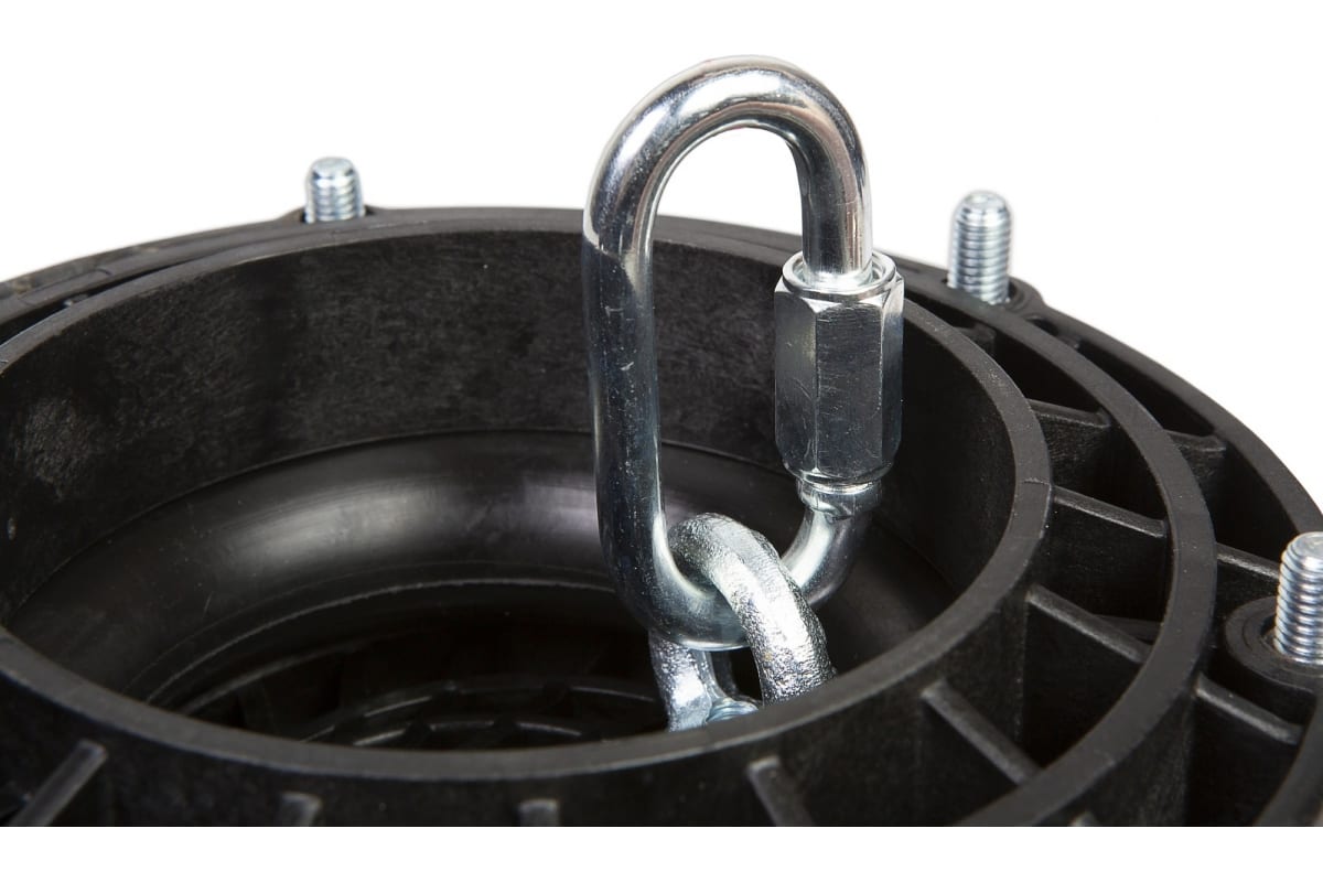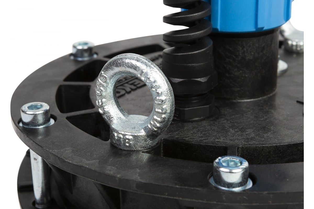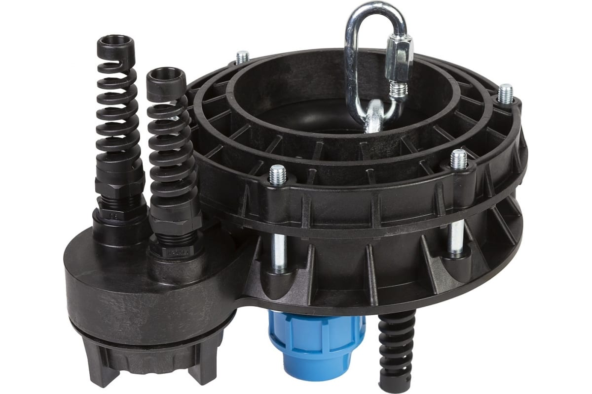 ? Крышка оголовка оснащена отверстиями для крепления троса, который используется для подвешивания насоса на нужную глубину.