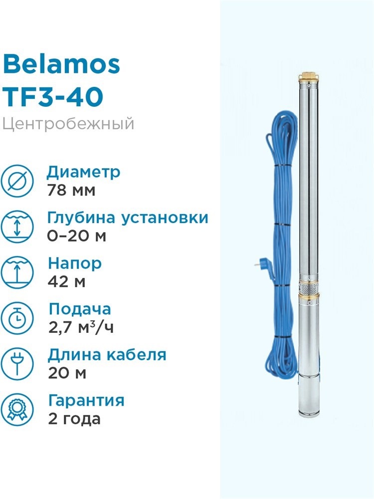 ?? Скважинный погружной насос Belamos TF3-40 разработан для высокоэффективной подачи чистой воды с большой глубины в жилищные объекты и для орошения сада. Устанавливается прямо в пробуренные скважины и применяется в автоматических системах водоснабжения дач, частных домов, коттеджей и других построек, не имеющих возможности подключения к центральной системе водоснабжения.?? Преимущества:
