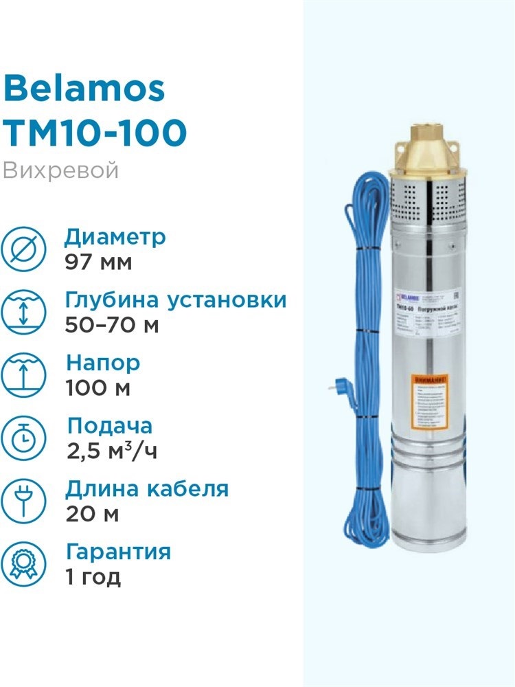 Насос скважинный погружной вихревой ТМ10-100 (4", 2100Вт, 2500л/ч, 100м) кабель 20м BELAMOS