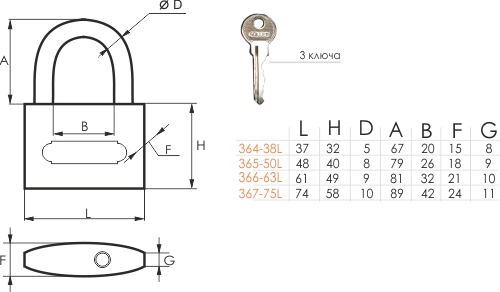 Замок навесной длинная дужка 366-63L (63мм) SOLLER
