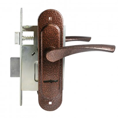 Замок врезной с ручками.Предназначен для установки в деревянные двери толщиной до 65 мм, правого и левого открывания.