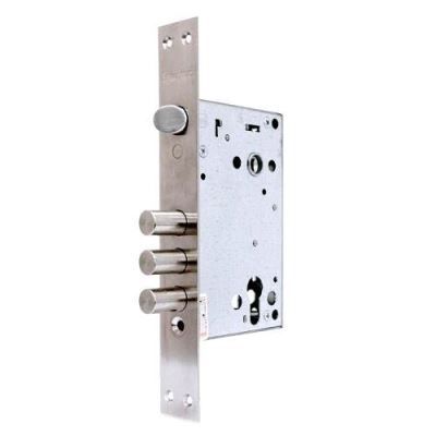 Замок врезной под цилиндровый механизм , предназначен для металлических и противопажарных дверей.Замок снабжен 3 ригелями и защелкой.