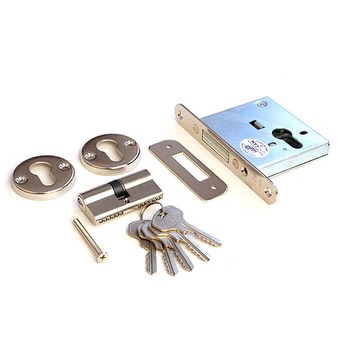 Замок врезной цилиндровый. Предназначен для входных и внутренних дверей толщиной 40-50 мм жилых домов, квартир, торговых помещений. Универсальный. Возможна установка как в правые, так и в левые двери. Комплектуется 6 стальными ключами. Закрывается и открывается только с помощью ключа. Прямоугольный засов. Покрытие корпуса — цинковое. Покрытие лицевой и ответной планок — никелевое.Механизм замка: цилиндровый