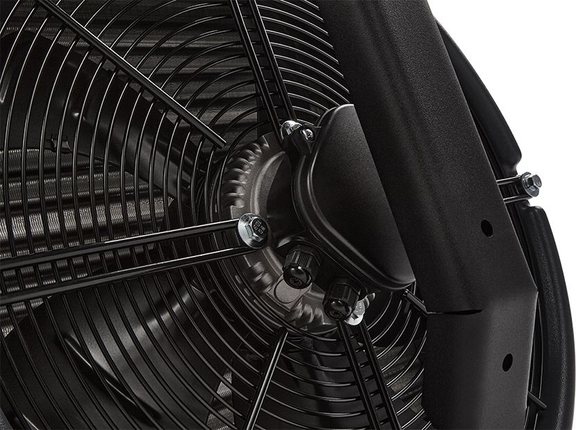 Осевой вентилятор диаметром 450 мм создает воздушный поток длиной 25 метров и обеспечивает максимальную производительность до 5400 м?/ч.
