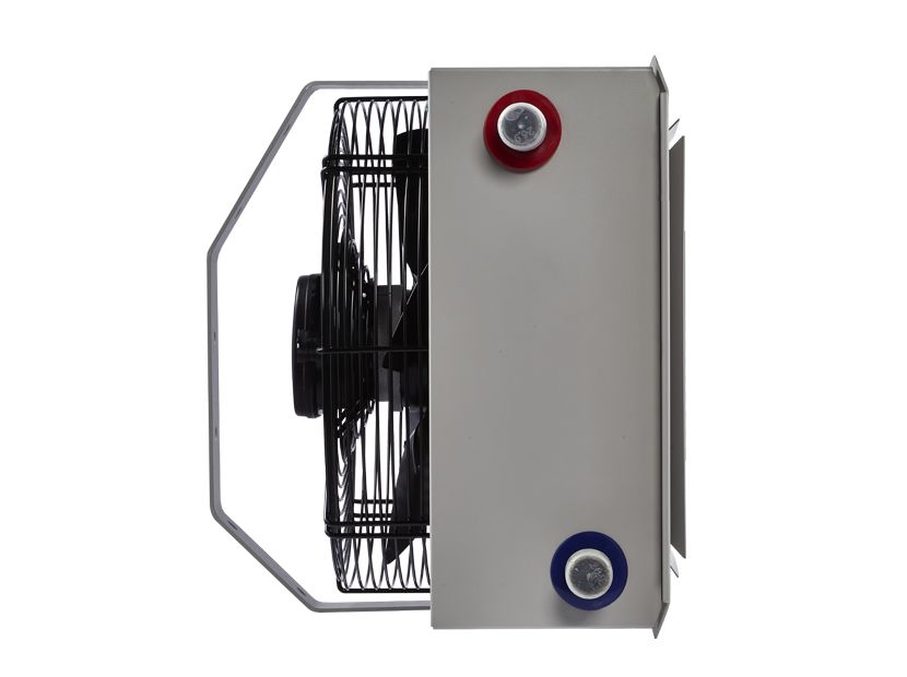 Водяной тепловентилятор устанавливается преимущественно на потолок при помощи кронштейна, который входит в комплект поставки. Выходная решетка в форме анемостата распределяет теплый воздушный поток в четырех направлениях.