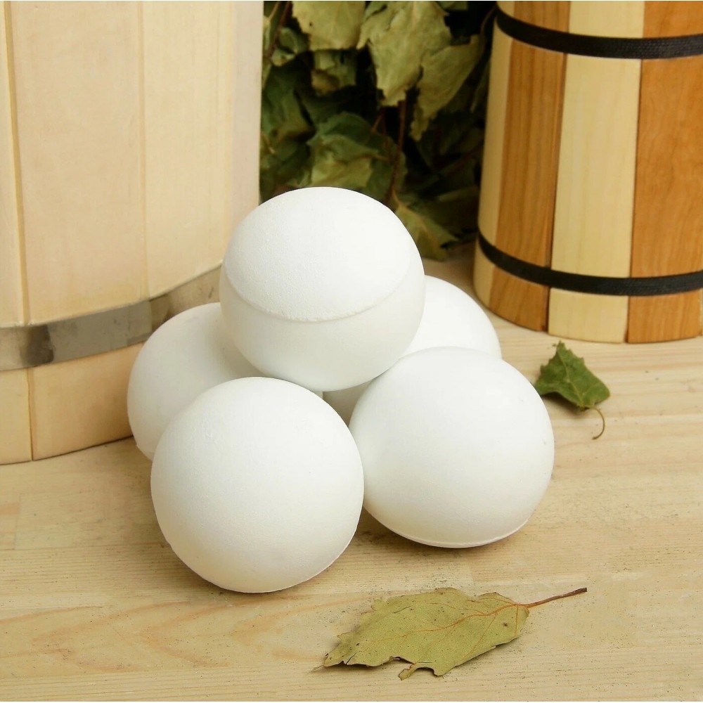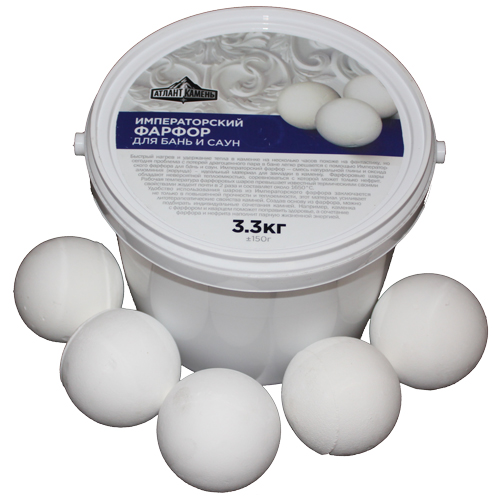 Шары для бани изготовлены из особого вида фарфора, они являются альтернативой природным камням. Этот фарфор отличается повышенной твердостью и прочностью, значительно превышающей прочность любого камня, что гарантирует их длительный срок службы. Также в процессе эксплуатации, при многократном нагревании и охлаждении, шары не изменяют свой первоначальный цвет. Фарфоровые шары выполнены из императорского фарфора - смеси натуральной глины и оксида алюминия (корунда), они обеспечивают более быстрый нагрев и отдачу тепла, обладают крайне высокой прочностью и теплоемкостью, аналогичной нефриту. Если шары из фарфора использовать совместно с другими камнями, то они усилят их терапевтические свойства и дольше будет сохраняться тепло. К примеру, целебный эффект от нефрита или кварца возрастет, если заложить данные породы в каменку с фарфоровыми шарами.