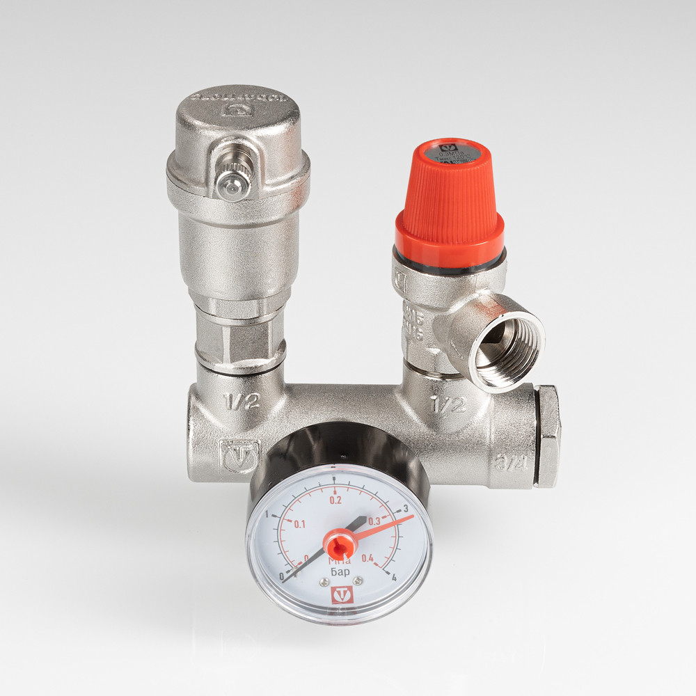 Состав изделия: предохранительный клапан (настройка – фиксированная, 3 бара), автоматический воздухоотводчик, манометр со шкалой 0–4 бар, латунный никелированный корпус.