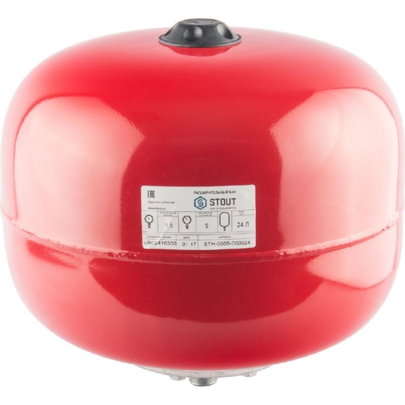 Бак расширительный 24 л красный вертикальный d 3/4", 5 bar STOUT?? Расширительный бак STOUT — это надежное и высококачественное решение для поддержания стабильного давления в системах отопления. Он предназначен для работы в закрытых системах, обеспечивая компенсацию изменений объема воды при нагревании и защищая оборудование от избыточного давления. Бак способствует улучшению работы системы отопления, предотвращая ее перегрузку и увеличивая срок службы всех компонентов.