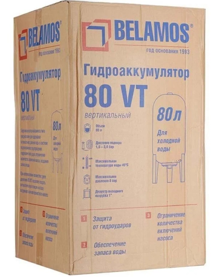 Гидропневмобак 80 л синий вертикальный BELAMOS 80 VT?? Гидропневматический бак BELAMOS — это надежное и эффективное решение для поддержания стабильного давления в системах водоснабжения и отопления. Он предназначен для работы с насосами, обеспечивая постоянное давление и защищая оборудование от гидравлических ударов. Бак способствует оптимизации работы системы, предотвращая ее перегрузку и увеличивая срок службы всех компонентов.