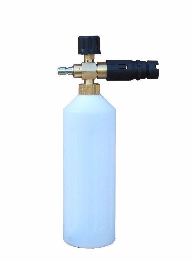 Насадка из высокопрочного полипропилена используется для нанесения пены на очищаемую поверхность. У модели есть несколько регулировок ширины распыления и давления на выходе.