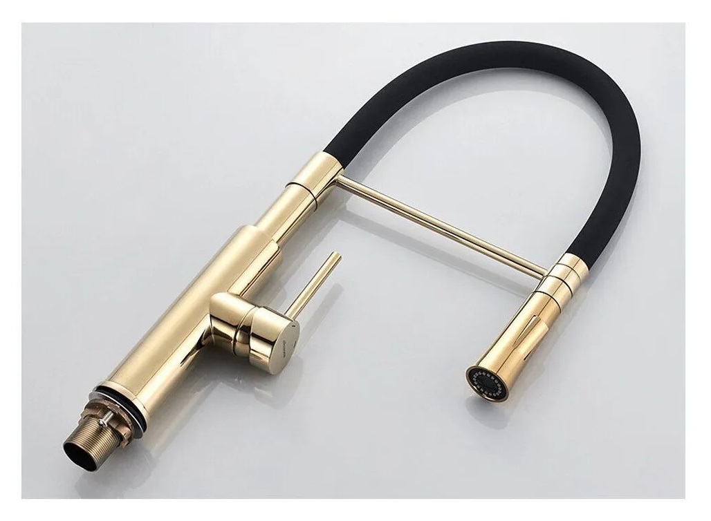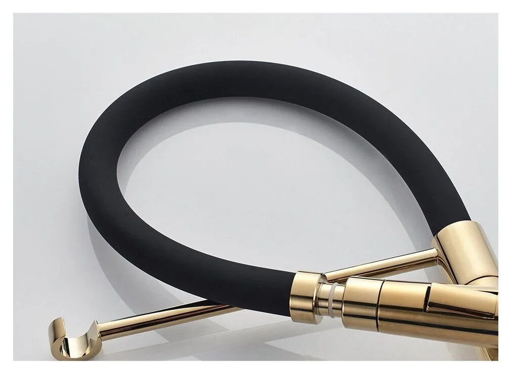 Смеситель из латуни - это гарантия надежности, кроме того смеситель имеет стильный современный дизайн. Смеситель с силиконовым гибким изливом с легкостью впишется практически в любой кухонный интерьер, а черный цвет с золотом будет стильно и изящно смотреться на кухне и станет ее украшением.
