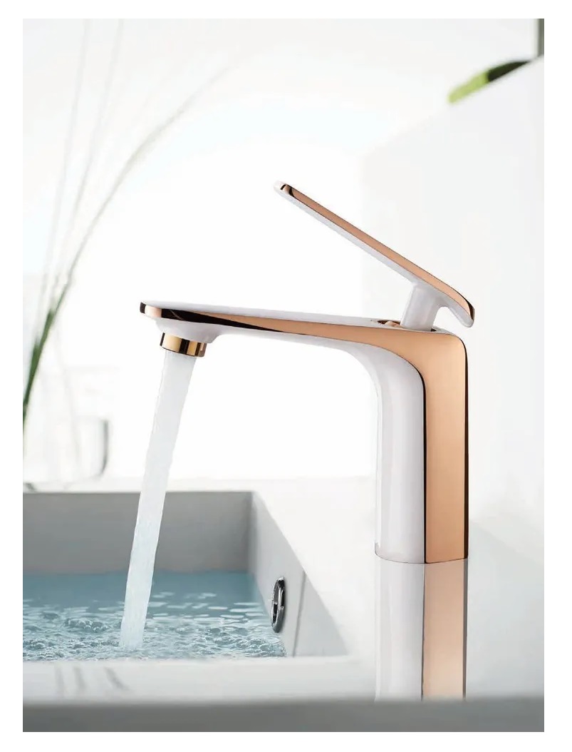 Смеситель для раковины с монолитным изливом в цвете белый + розовое золото придает в себе современный, лаконичный и оригинальный дизайн, комфортное пользование.