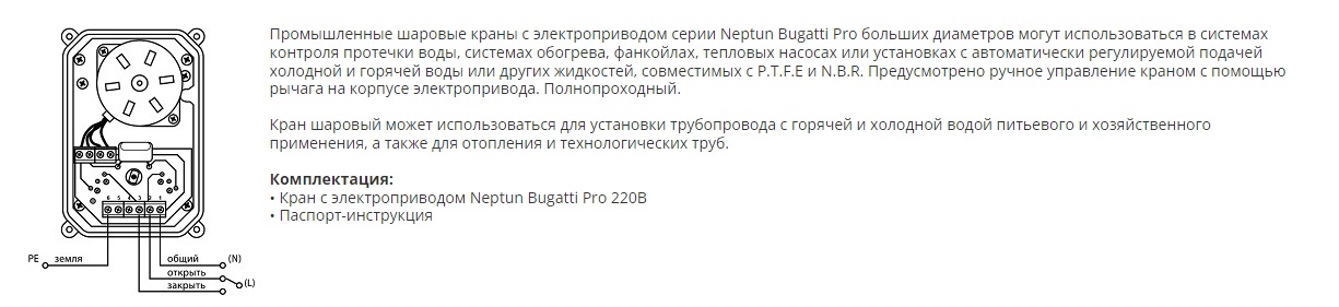 Промышленные шаровые краны с электроприводом серии Neptun Bugatti Pro больших диаметров могут использоваться в системах контроля протечки воды, системах обогрева, фанкойлах, тепловых насосах или установках с автоматически регулируемой подачей холодной и горячей воды или других жидкостей, совместимых с P.T.F.E и N.B.R.Предусмотрено ручное управление краном с помощью рычага на корпусе электропривода. Полнопроходный.